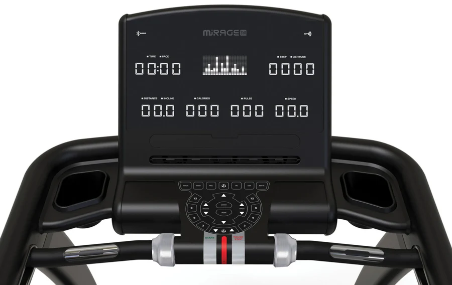 La console dispone di 6 display LED bianchi e un display grafico LED, che mostrano velocità, inclinazione, frequenza cardiaca, distanza, tempo, calorie consumate, step, altitudine e ritmo (pace). La plancia è touch screen capacitiva.